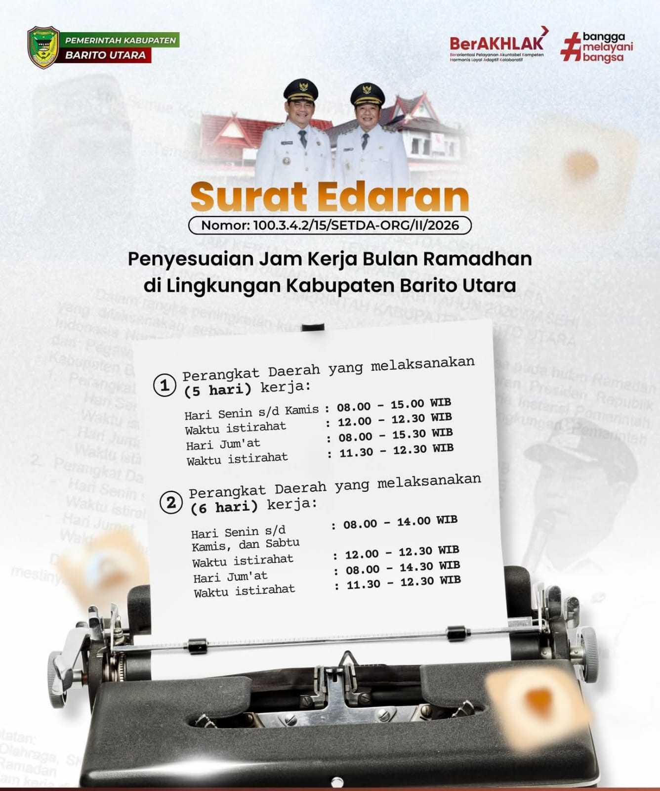 Muara Teweh – Pemerintah Kabupaten Barito Utara mengeluarkan surat edaran tentang penyesuaian jam kerja bagi Aparatur Sipil Negara (ASN) dan pegawai di lingkungan Pemkab Barito Utara selama Bulan Suci Ramadhan 1447 Hijriah.