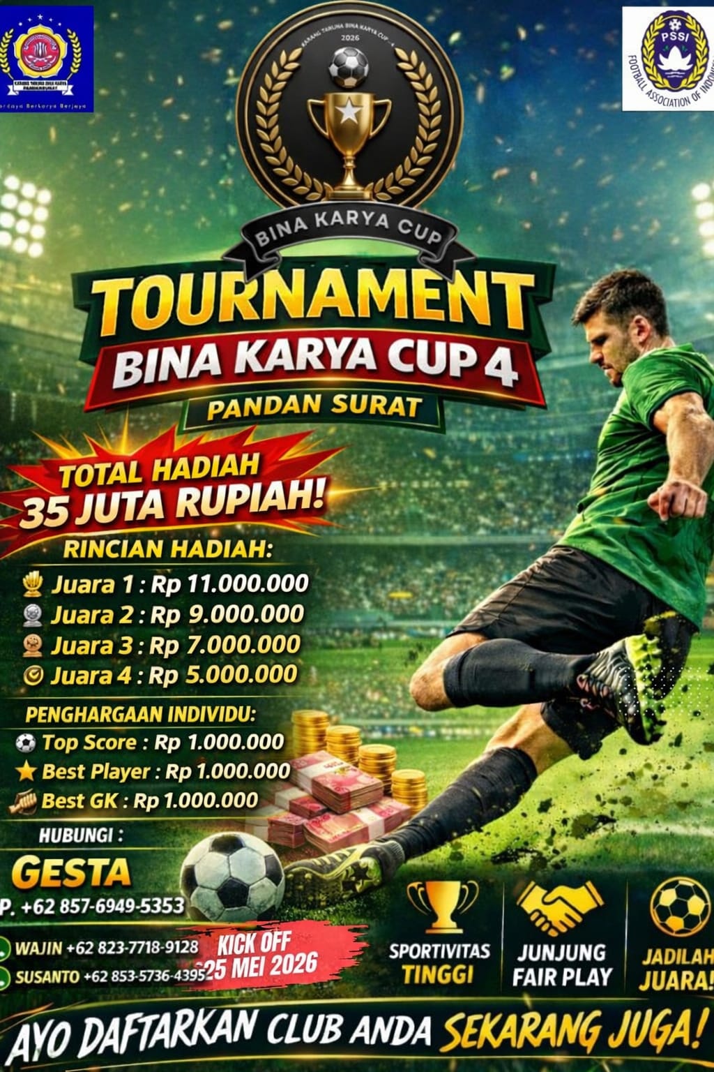Mengusung tema “Sportivitas Tinggi, Junjung Fair Play, Jadilah Juara!”, turnamen ini dijadwalkan mulai bergulir pada 25 Mei 2026.Panitia penyelenggara menyiapkan total hadiah bernilai puluhan juta rupiah, yang diharapkan mampu memacu semangat dan meningkatkan kualitas permainan para peserta.