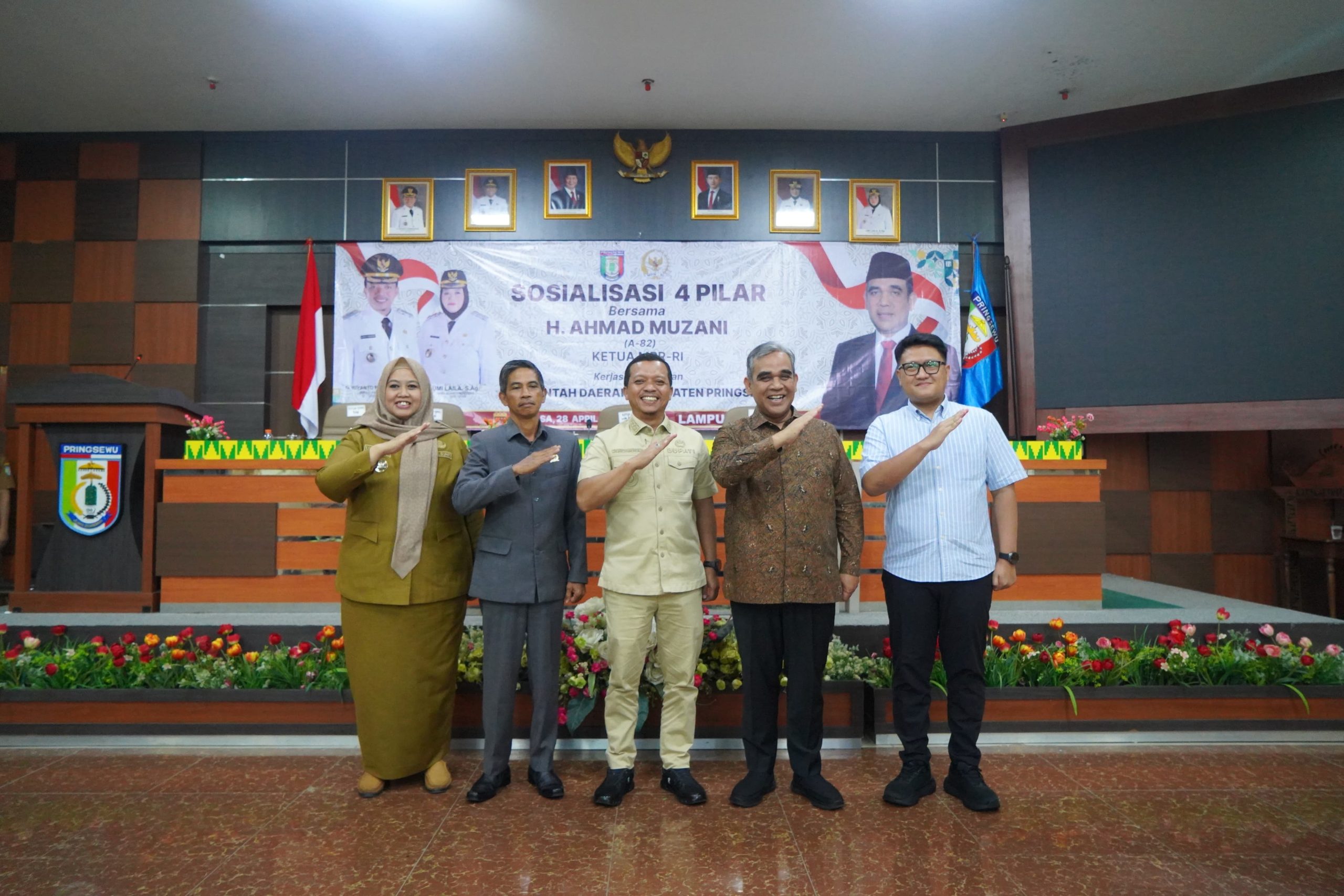 Pringsewu – Ketua MPR RI Ahmad Muzani melakukan kunjungan kerja ke Kabupaten Pringsewu Provinsi Lampung. Ketua MPR RI didampingi Ketua DPRD Provinsi Lampung Ahmad Giri Akbar beserta sejumlah anggota DPRD Provinsi Lampung disambut dan diterima oleh Bupati Pringsewu Riyanto Pamungkas dan Wakil Bupati Pringsewu Umi Laila, Ketua DPRD Pringsewu Suherman beserta jajaran pemerintah daerah, DPRD dan forkopimda Kabupaten Pringsewu. Pada kesempatan tersebut, juga dilakukan tukar-menukar cinderamata antara Ketua MPR RI dan Bupati Pringsewu, serta Sosialisasi Empat Pilar Kebangsaan di Aula Utama Kantor Bupati Pringsewu, Selasa (28/4/2026).